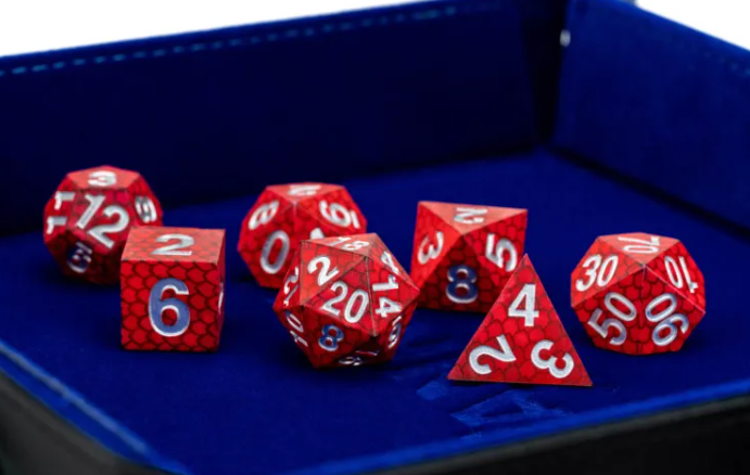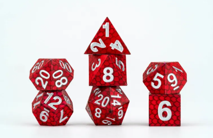 Silicone Dragon Scale dice feature a new technology to transfer printed designs on silicone dice. Sharp edges provide a sharp roll that is complemented with the slight bounce of silicone. Each full-sized, 16mm set comes with 7 dice (d4, d6, d8, d10, d10% (00-90), d12, and d20).