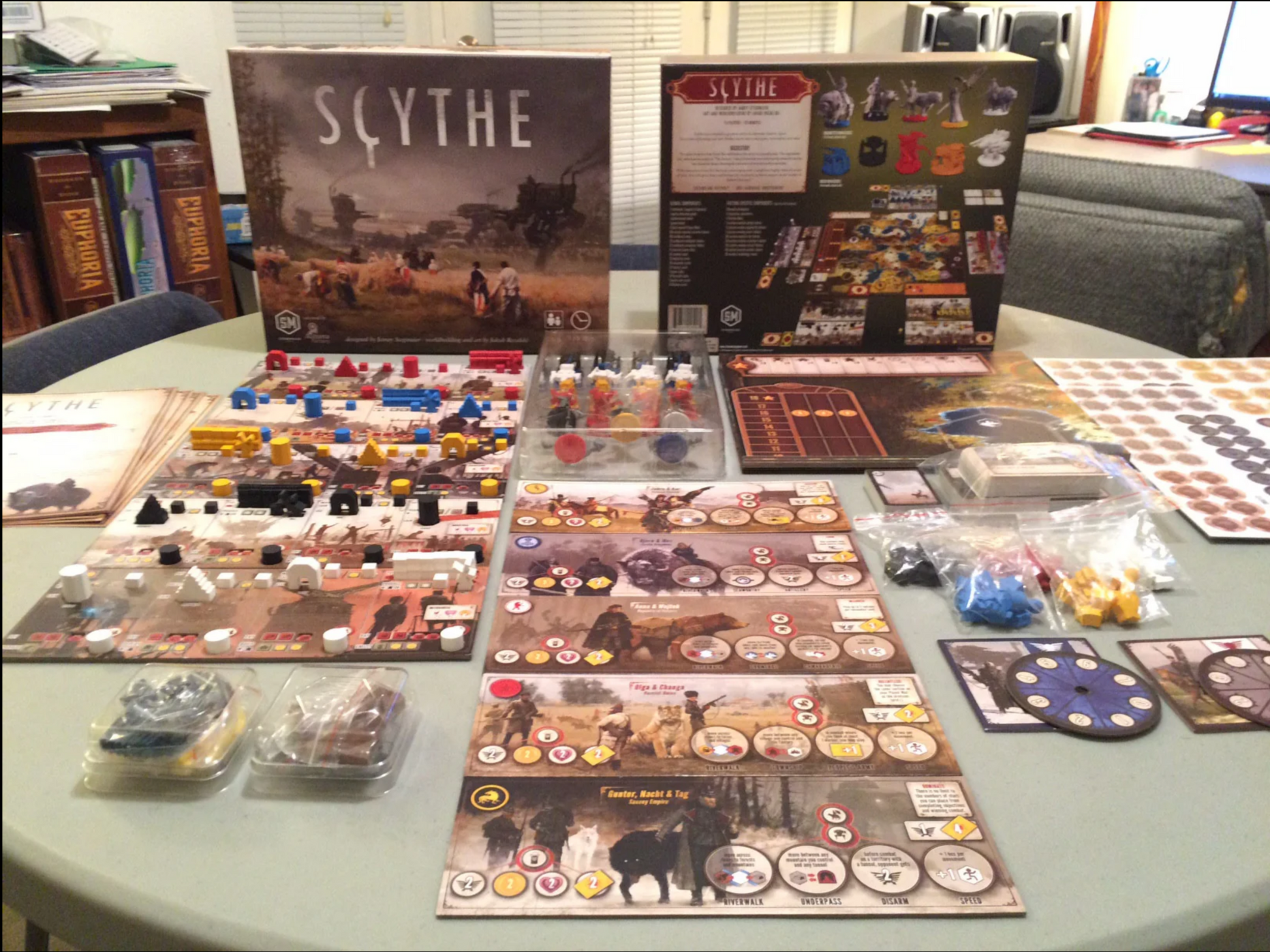 Scythe is an engine-building, asymmetric, competitive board game set in an alternate-history 1920s period. It is a time of farming and war, broken hearts and rusted gears, innovation and valor. It plays 1-5 players in about 115 minutes, and it features art & worldbuilding by the acclaimed Jakub Rozalski.