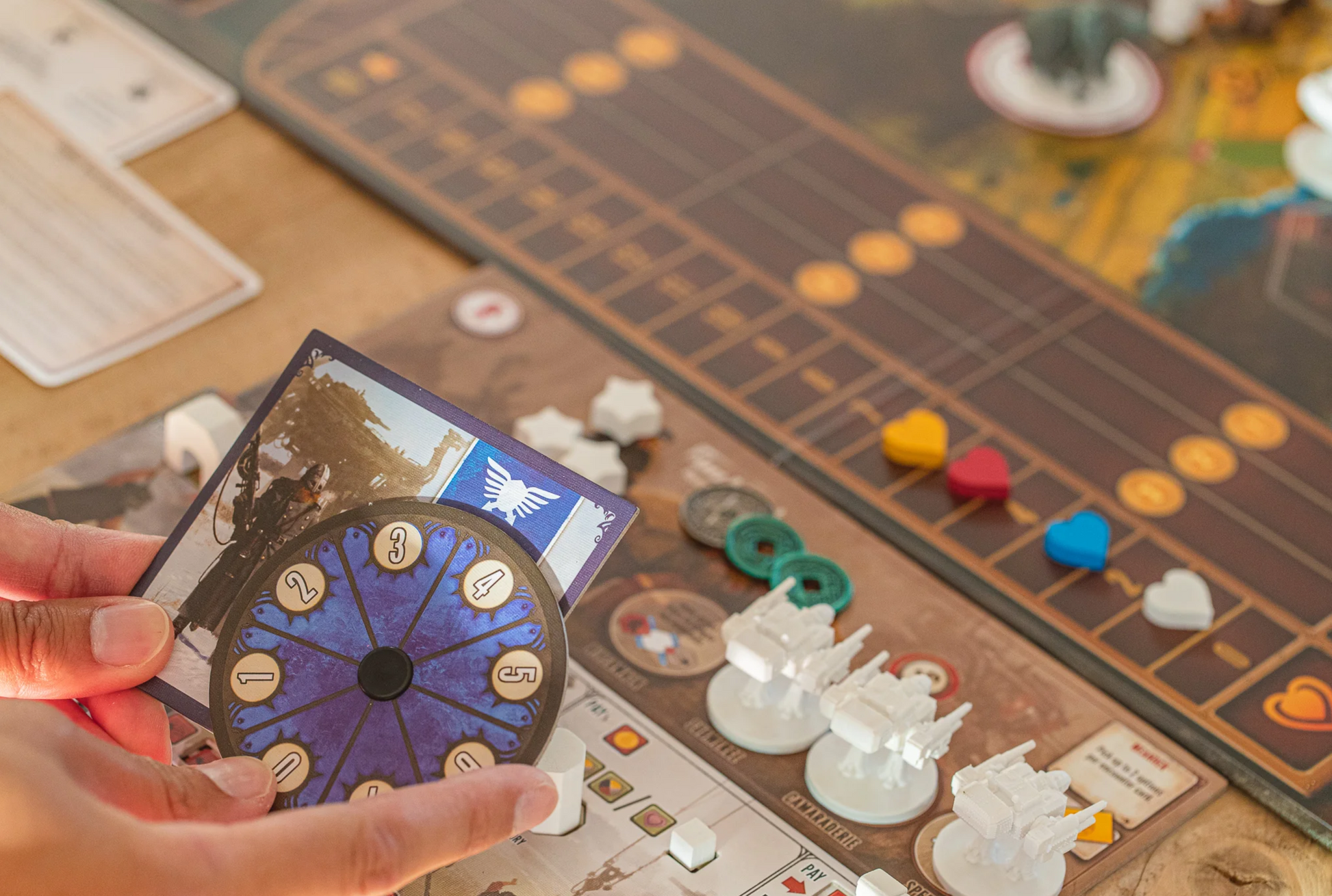 Scythe uses a streamlined action-selection mechanism (no rounds or phases) to keep gameplay moving at a brisk pace and reduce downtime between turns. While there is plenty of direct conflict, there is no player elimination, nor can units be killed or destroyed.