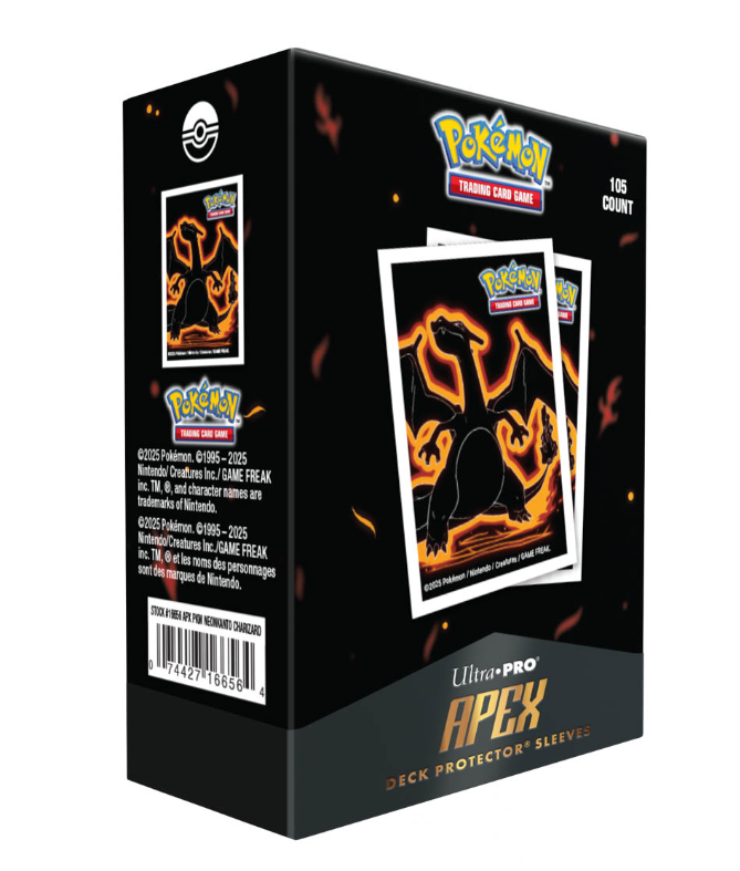 The 105ct APEX Deck Protector Sleeves for the Pokemon Trading Card Game are made with our new easy-shuffle formulation and feature bold artwork of Venusaur, Charizard or Blastoise bursting through a dark background on a textured back. Archival-safe polypropylene materials ensure you can sleeve your cards with confidence, and the gloss clear front allows your foil cards to shine! Sized for standard size trading cards measuring 2.5 in. x 3.5 in.