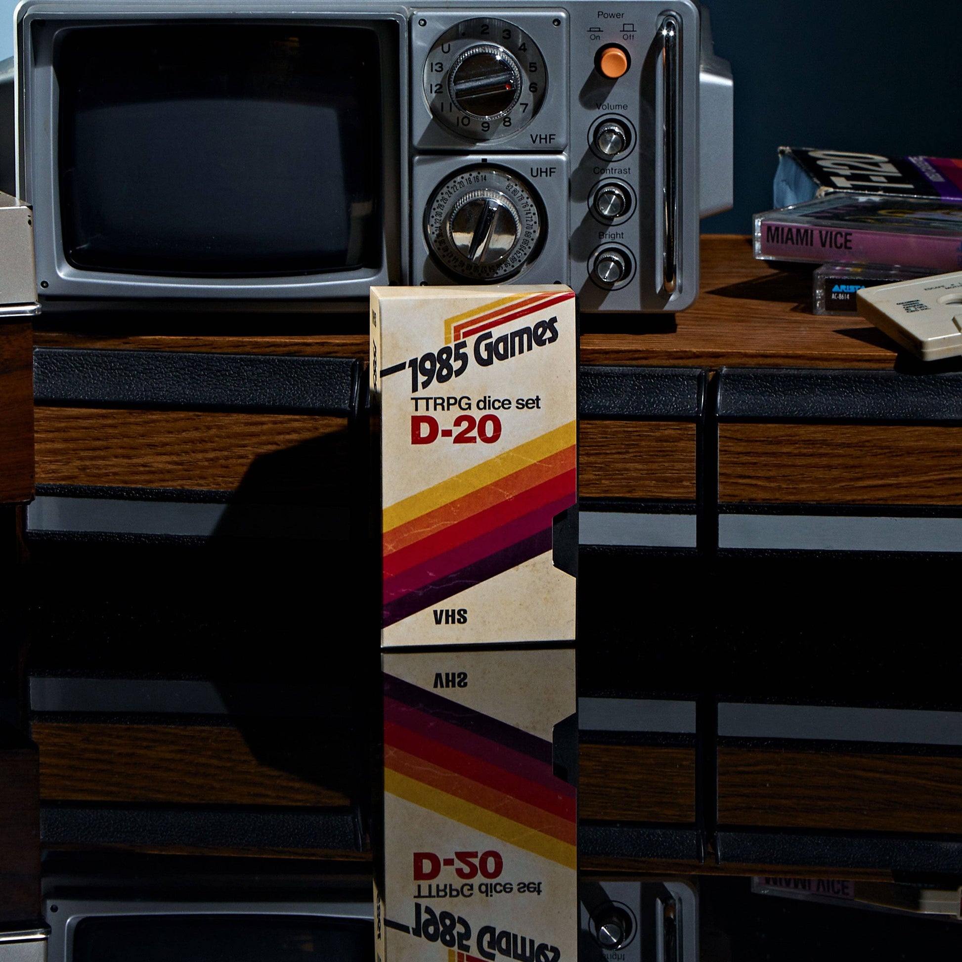 1985 Games Presents... The last set of VHS-themed sharp-edge resin dice you'll ever need.